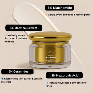 Meet your everyday luxury, a silky, lightweight crème that floods your skin with long-lasting moisture, brightens dullness, and strengthens your barrier with every application. Powered by 5% Niacinamide, multi-weight Hyaluronic Acid, and barrier-loving Ceramides, this moisturizer leaves your skin plump, radiant, and velvety soft.