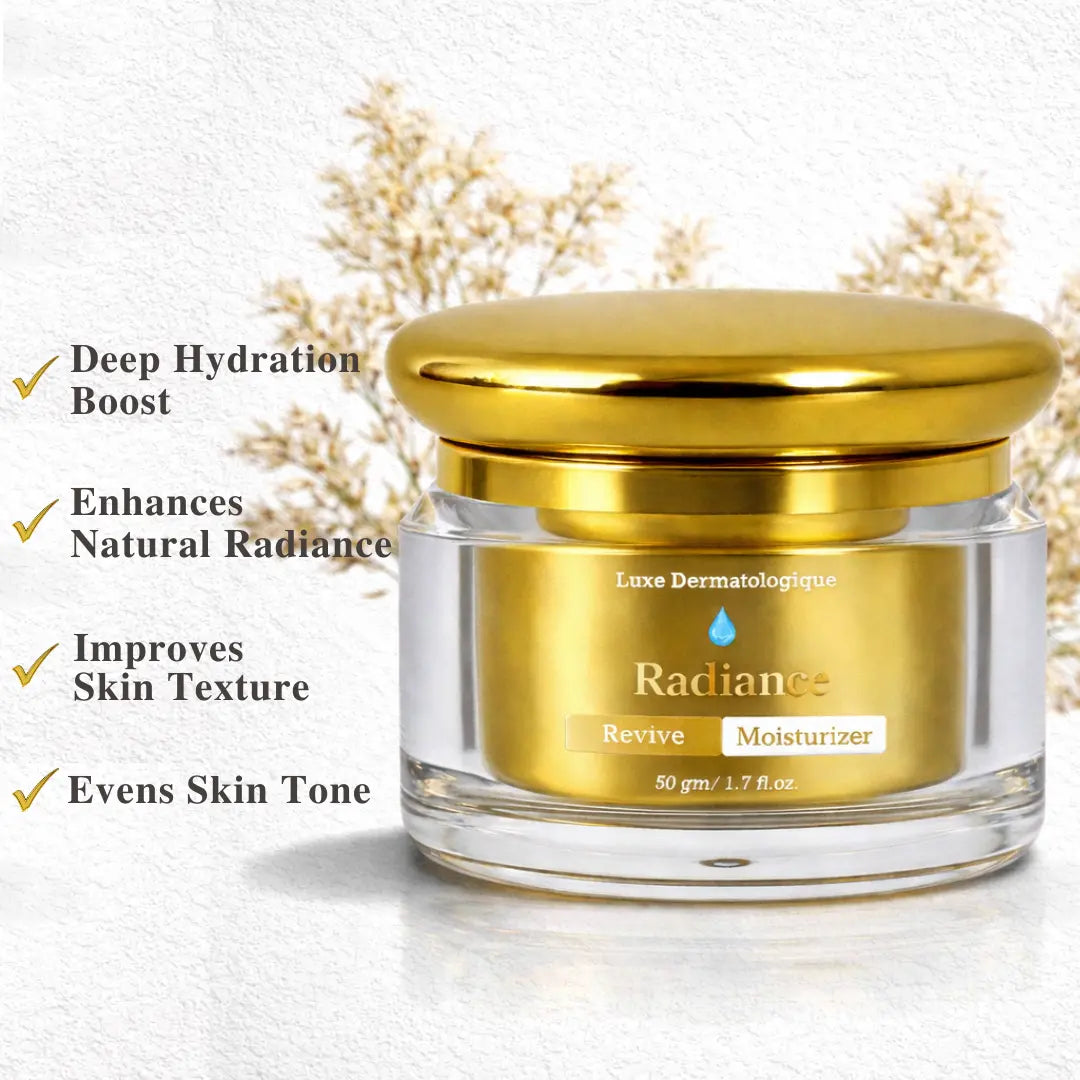 GlowBareSkin Radiance Revive Moisturizer 50 gm is a lightweight daily crème formulated to deliver deep hydration and targeted brightening. Its primary active is 5% Niacinamide combined with multi-weight Hyaluronic Acid and Ceramides to plump skin and repair the moisture barrier.